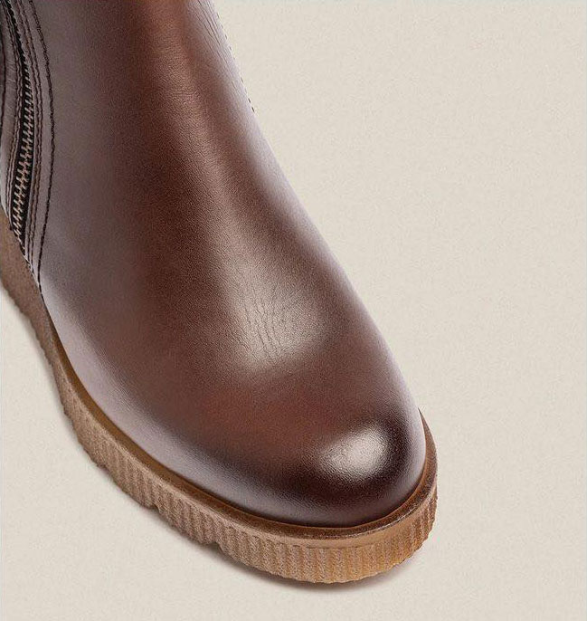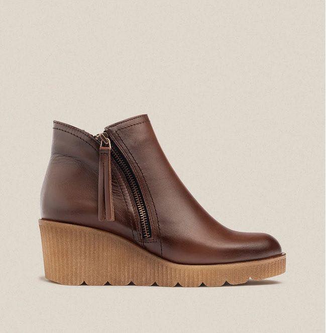 Bottines compensée pour femme de la collection YOKONO modèle MADONA 007 de couleur marron promet un maximum de confort au quotidien. Son design minimaliste en fait un incontournable de notre garde-robe, mettant en valeur sa semelle beige avec relief. Fermeture éclair pour un enfilage facile. Cuir de vache coupé et fabriqué à la main en Espagne avec des teintures végétales respectueuses de l’environnement.